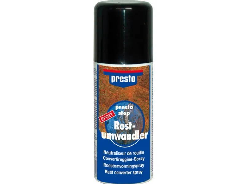 Das Rostumwandler-Spray von presto ist Rostsanierung und Grundierung in einem. Das Rostsanierungs-System auf Epoxidharzbasis bildet mit der neutralisierten Rostschicht einen metallisch-organischen Eisenkomplex, welcher als Grundierung für die nachfolgende Lackierung geeignet ist. Das Rostumwandler-Spray ist für die Sanierung von Fahrzeugen, Maschinen und Anlagen aller Art geeignet.
