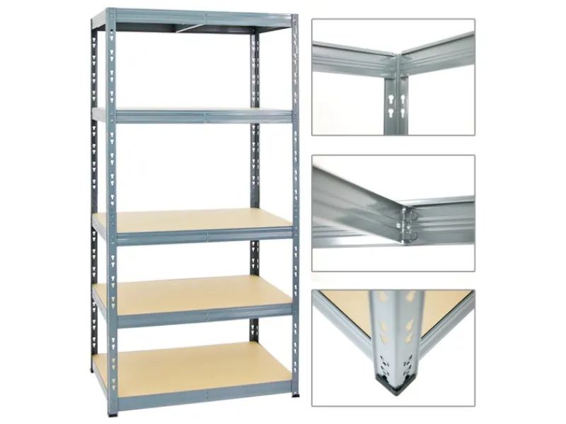 Das Schwerlastregal ist 180 cm hoch, 90 cm breit und 60 cm tief. Die Farbe ist Grau