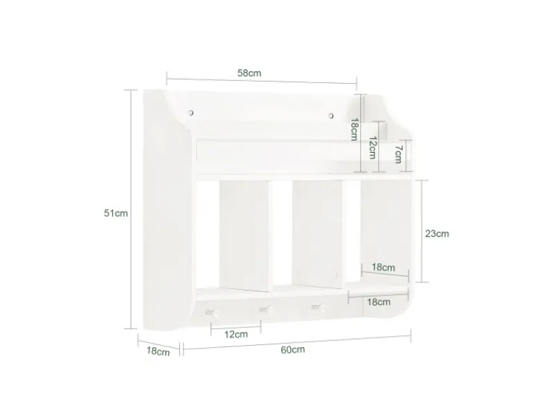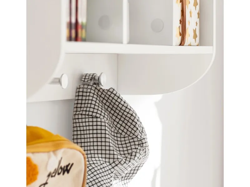 Kleine Schultaschen und Kleidung können an drei Haken aufgehängt werden.
