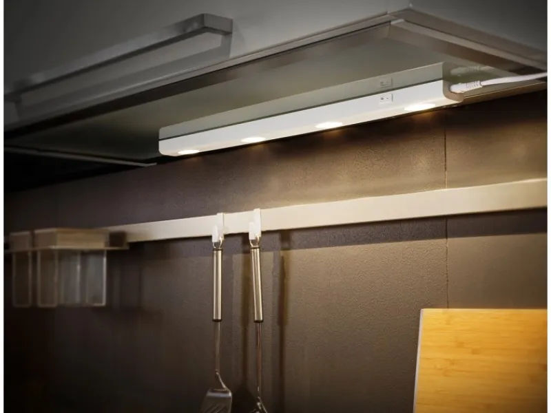 Die LED-Unterbauleuchte ist aus weißem Kunststoff gefertigt und mit einem Ein-/Ausschalter ausgestattet. Sie ist vielseitig einsetzbar und kann sowohl senkrecht, als auch waagerecht befestigt werden. Durch ihre geringe Breite von nur 4 cm eignet sich die Leuchte ideal für den Einsatz an der Wand oder in Küchen und Regalen. Die Leuchte ist mit 4 x 1 W fest verbauten SMD LEDs ausgestattet. Die LEDs haben eine lange Lebensdauer von 30.000 Stunden und strahlen in Warmweiß mit einer Farbtemperatur von 3.000 K.