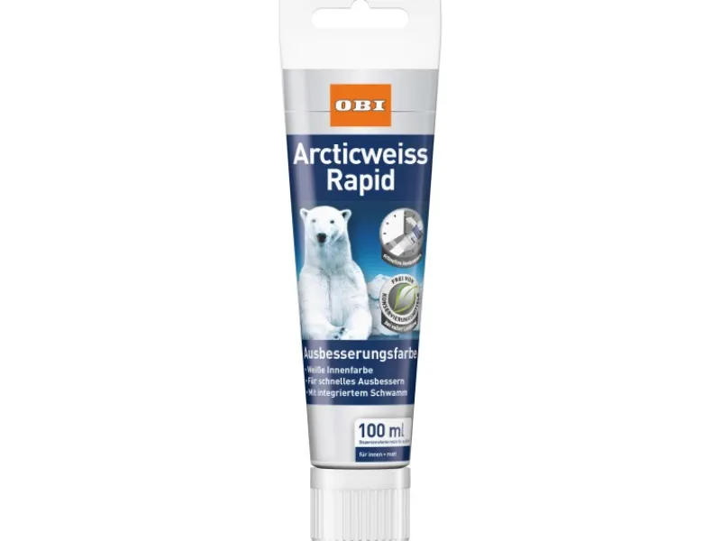Durch leichten Druck auf die Tube wird der integrierte Schwamm mit der Farbe befüllt. Tragen Sie OBI Arcticweiß Rapid gleichmäßig auf die auszubessernde Stelle auf. Nach der Trocknungszeit von sechs Stunden ist die behandelte Stelle scheuerbeständig und nach 24 Stunden komplett belastbar.