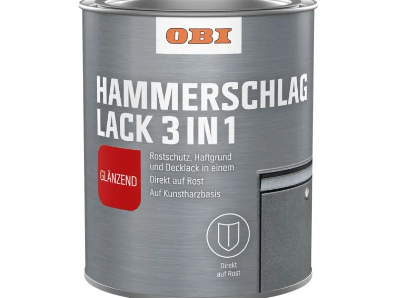 Der Obi Hammerschlaglack 3 in 1 ist ein lösemittelhaltiger, aromatenfreier, haftstarker Spezial-Metallschutzlack auf Kunstharzbasis für dekorative und rostschützende Anstriche auf Metallen. Der aktive Rostschutzpigmente versiegelt den Rost zuverlässig, während gleichzeitig hochwertige Harze eine witterungsbeständige, feuchtigkeitsschützende Deckschicht bilden. Der Hammerschlaglack ist somit nicht nur Grundierung und Korrosionsschutz, sondern auch ein perfekter Decklack in effektvoller Hammerschlag-Optik. Er ist auch für die Lackierung von vorbereiteten und grundierten Untergründen aus NE-Metallen sowie tragfähigen Altanstrichen im Innen- und Außenbereich geeignet. Der Inhalt reicht für etwa 8 m².