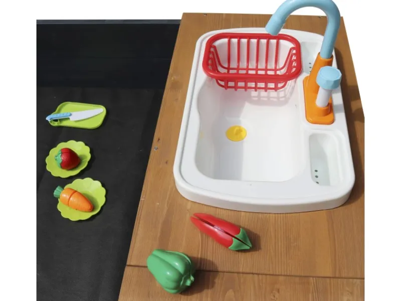 Fülle das weiße Tablett mit Wasser und deine Kinder können die kleine Pumpe drücken, um den Wasserhahn laufen zu lassen. So können deine Kinder nach dem Backen und Kochen gemütlich das Geschirr abwaschen. Wenn du den Stöpsel hochziehst, kann das Spülwasser in den Behälter darunter ablaufen. Du kannst das weiße Tablett mit dem Wasserhahn ganz einfach abnehmen, so dass eine „Mud Kitchen“ entsteht. Ideal bei schönem Wetter! Der nasse Sand ist ein toller Ort zum Herumspielen und Kneten. Denn durch die festere Form des Sandes können deine Kinder noch besser bauen!