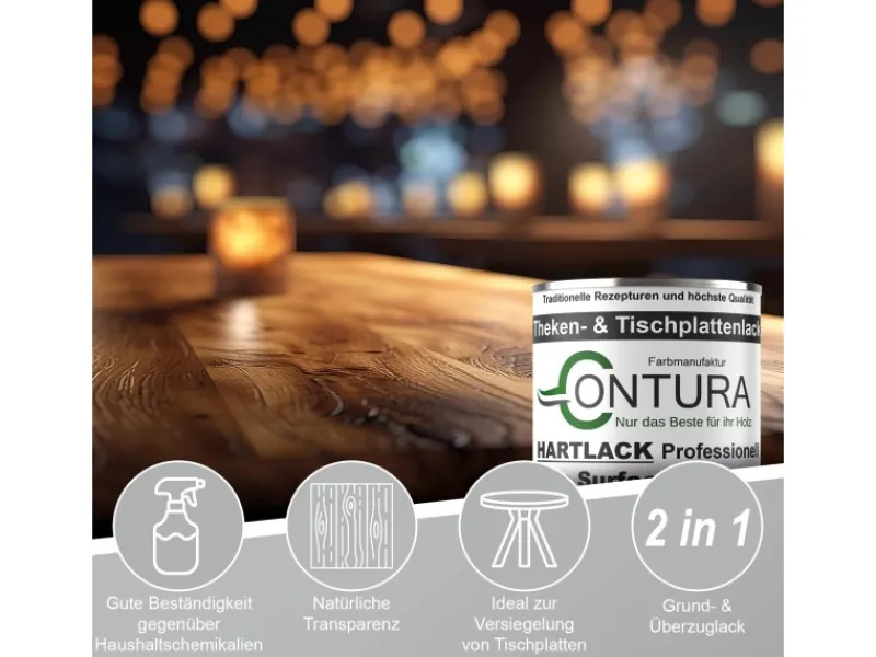 Der…. widerstandsfähige Theken, Tischplatten und Parkettlack auf Wasserbasis!Hochwertiges Poly- / Acryl- Lacksystem (Extra Hart) -Menge und Glanzgrad zur Wahl- Dieser hochwertige Tischler Tischplatten- und Thekenlack ist ideal zur Versiegelung von Tischplatten, Treppen und sogar für Holzböden geeignet. Er zeichnet sich durch eine sehr hohe Füllkraft, schnelle Trocknung, „EXTRA“ hohe Kratzfestigkeit, gute Schleifbarkeit und durch eine ästhetische Optik sowie extrem widerstandsfähige Oberfläche aus.Der Lack findet auf allen Holzoberflächen seinen Einsatz! Dieser hochwertige Hydro- Lack weist eine sehr gute Beständigkeit gegen Wasser und sogar Trinkalkohol auf, er besitzt eine hohe Licht (UV) und Kratzbeständigkeit! Seine Produktstärke liegt auch in der feinen Optik. Ideal für Eiche oder Buche Tischplatten und Fußböden im innenbereich, sieht super schön aus!Wir benutzen diesen Lack seit Jahren (speziell für beanspruchende Tischplatten im Wohnbereich), mit besten Ergebnissen die uns und unsere Kunden überzeugen! Dieser Hochwertige Lack ist sehr ergiebig, der Verbrauch liegt bei nur ca.8-10 qm / je Liter! Dieses Produkt ist keine gefährliche Zubreitung nach dem Chemikaliengesetz und daher nicht Kennzeichnungspflichtig! Ein weiterer Vorteil ist die sehr leichte und Ansatzlose Verarbeitung des Materials!Ganz einfach zu verarbeiten!Kann auch gegossen, und gerakelt werden!Sie können diesen hochwertigen Lack mittels Pinsel, Spritzpistole oder Rolle fein auftragen. Nach ca. 1-2 aufträgen erhält man eine seidenmatt- ästhetische, seidige Oberfläche! Rauhe oder unbehandelte Oberflächen sollten mit diesem Lack grundiert werden!