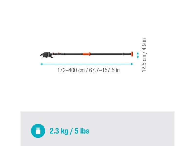 Teleskopierbar von 175 cm bis 400 cm, abwinkelbarer Schneidkopf für Höhen