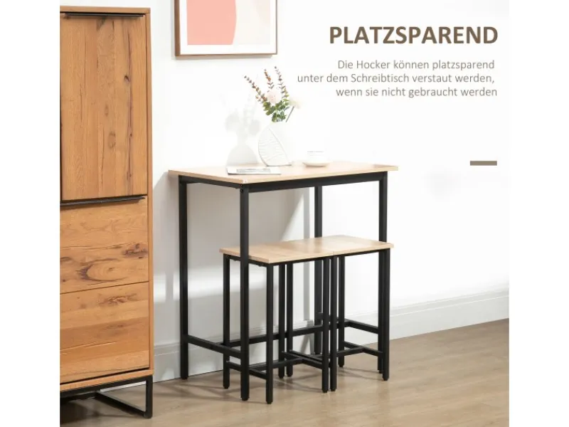 Dieses Bartisch mit Barhocker Set von HOMCOM überzeugt durch ihren trendigen Industrie-Look und ihr cleveres, platzsparendes Design. Die Kombination aus schwarzem Metall und einem Obermaterial in Holzoptik verleiht diesen Möbeln einen trendigen Industrie-Look. Ein Bistrotisch mit 2 Stühlen bieten 2 Personen einen gemütlichen Sitzplatz. Dank seines cleveren Designs können die Hocker bei Nichtgebrauch platzsparend unter dem Hochtisch geschoben werden.
