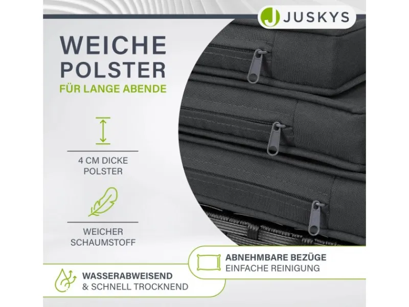 Ein zusätzliches Plus sind die 4 cm dicken Kissen in dunklem grau. Lassen Sie sich in die weiche Sitzfläche fallen und die Anstrengungen des Tages hinter sich. Die pflegeleichten Auflagen mit Polster punkten durch abnehmbare und waschbare Bezüge. So sind Sie mit Ihrer modernen Gartenlounge startklar für den Sommer.