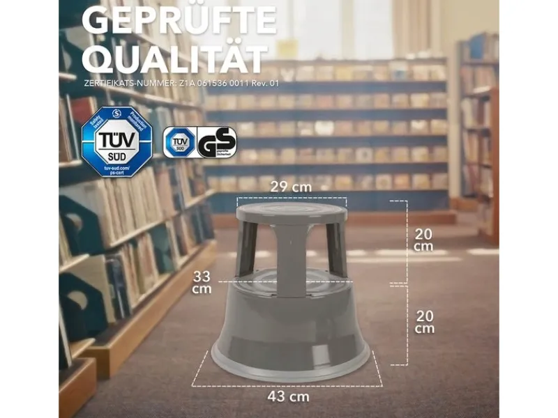 Der ausgesprochen robuste Rollhocker aus Stahl ist ein praktischer Helfer für zu Hause, das Büro oder Ladengeschäfte. Mit ihm gewinnen Sie 40 Zentimeter an Größe, wenn etwas in unerreichbaren Höhen erreicht werden soll. Aus diesem Grund sind Rollhocker auch in praktisch jeder Bücherei, jedem Archiv oder Supermarkt vorzufinden. Neben seiner originären Funktion kann der in drei Farben erhältliche „Elefantenfuß“ auch als Sitzgelegenheit für eine kurze Rast oder als Ablage genutzt werden. Die Sicherheit des Rollhockers wurde durch ein Zertifikat des TÜV Süd bestätigt.