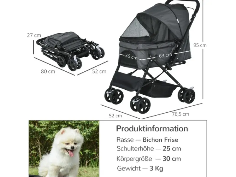 Mit diesem Hundebuggy von PawHut können Sie Ihren Hund sicher draußen transportieren. Er verfügt über leichtgängige Räder und einen stabilen Griff, sodass Sie ihn einfach mitnehmen können. Der obere Korb ist geräumig, sodass Ihr Hund im Inneren viel Platz hat. Der Lenker ist umkehrbar, sodass ihr Hund sie oder die Umgebung anschauen kann. Geeignet für kleine Hunde wie Bichon Frise und Mops.