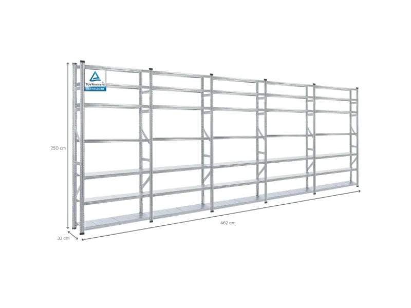 Es ist ein Stecksystem im modernen Design, welches ohne Schrauben und ohne störende Kreuzverbände auskommt. Das Schwerlastregal wird mit vormontierten Rahmen geliefert und kann dadruch kinderleicht und sehr schnell aufgebaut werden. Selbstverständlich sind die Fachböden einfach und werkzeuglos im 3,3 cm Raster in der Höhe verstellbar.