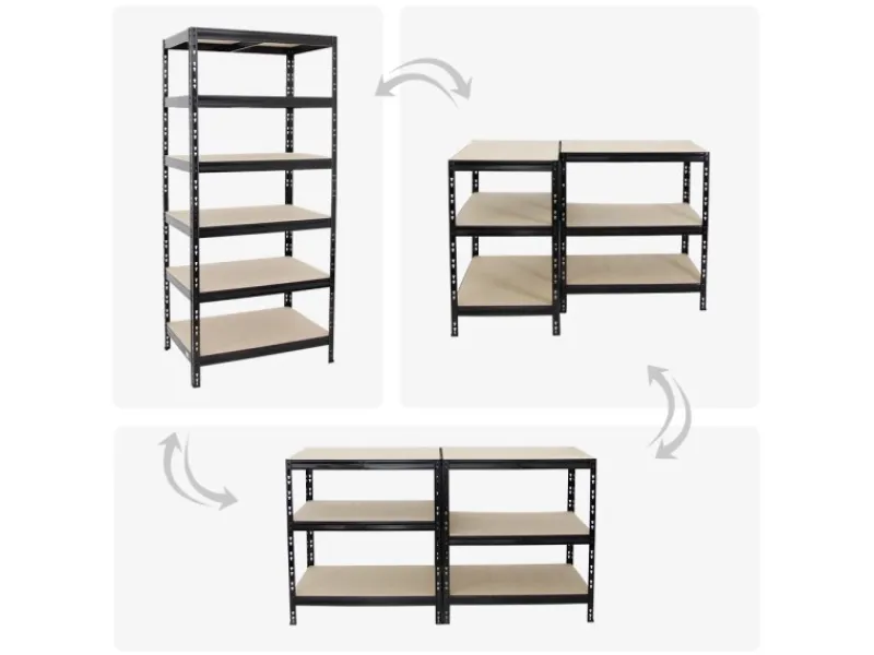 Das Metall ist pulverbeschichtet, um eine lange Lebensdauer sicherzustellen und entgratet, um unangenehme Schnittkanten zu beseitigen. Der Aufbau ist einfach und erfolgt durch Steckmontage mit dem Butterfly-System. Es genügt ein Gummihammer. Um dem Schwerlastregal zusätzliche Stabilität zu geben, kann das Regal an der Wand verschraubt werden. Auch die Verbindung von mehreren Regalen ist möglich. Darüber hinaus kann das Regal in zwei Werkbänke umfunktioniert werden. Hierfür lassen sich die vertikalen Streben in der Mitte teilen, um so zwei separate Werktische bauen zu können.