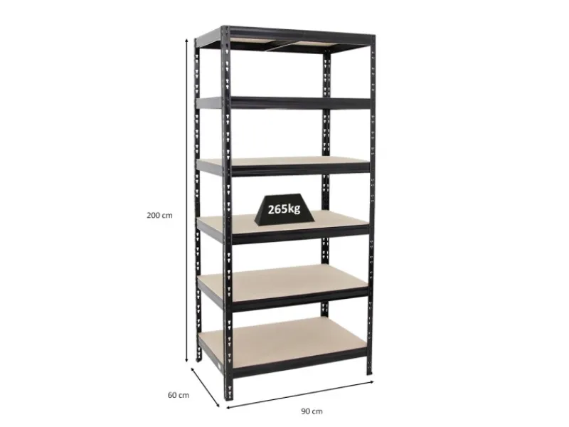 Das Schwerlastregal ist 200 cm hoch, 90 cm breit und 60 cm tief. Die Farbe ist Schwarz