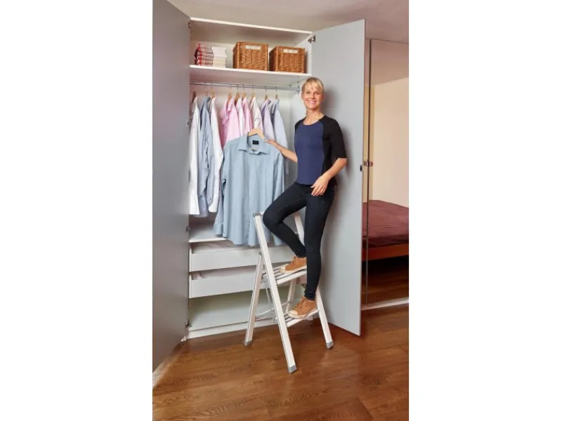 Ausgeklappt hat die Leiter ein Maß von (B x H x T): 44 cm x 94 cm x 51 cm. Abhängig von der Körpergröße kann eine Arbeitshöhe von ca. 230 cm erreicht werden.