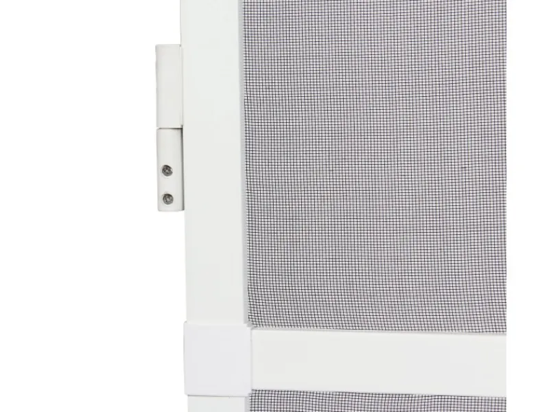 Profile für Insektenschutztüren aus Aluminium (pulverbeschichtet) in weiß Maße des Aluminium-Rahmens (oben, links, rechts): 30 mm x 11 mm Maße der Fußleiste: 90 mm x 11 mm Maße der Mittelschiene: 30 mm x 11 mm Höhe der unteren Bürstendichtung (über Fußleiste): 10 mm Breite der Scharniere : 20 mm Breite der drei Magnete für den Verschluss auf der gegenüberliegenden Seite der Scharniere: 12 mm Griffe und Winkel aus weißem PVC Graues Fliegennetz aus Fiberglas (PVC beschichtet), weich und strapazierfähig 180° Öffnung
