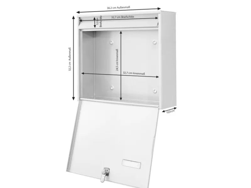 Gesamtgröße: 36,2×32,2x10cm BxHxT, Briefschlitz: 32,7 x 3,2cm BxH, Gewicht: ca. 3 kg