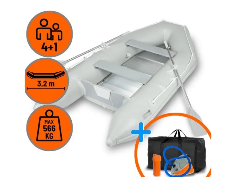 Das EBERTH SP1-566A Schlauchboot eignet sich für 4 Personen +1 Kind und hat eine maximale Traglast von bis zu 566kg. Material aus PVC, der Aluboden und die Sitzbänke machen das Boot sehr stabil und komfortabel, sodass auch längere Ausflüge damit bequem und sicher absolviert werden können.