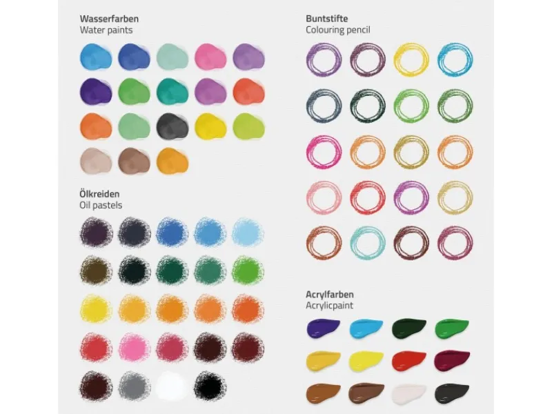 Mit Ölpastellkreide, Acrylfarbtuben, Wasserfarben und Buntstiften