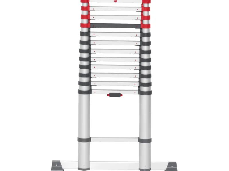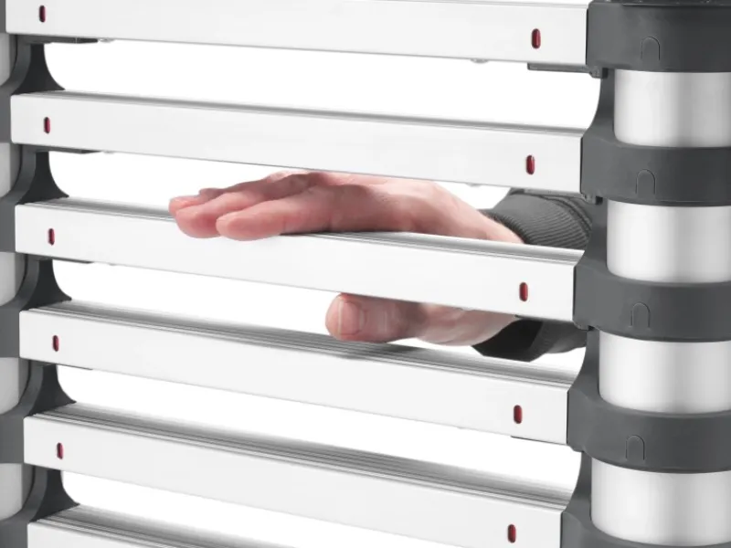 Dank des Sicherheitsabstands zwischen den Sprossen besteht keine Klemmgefahr. Zudem lässt sich der Verriegelungsstatus durch die farbige Verriegelungsanzeige an jeder Sprosse leicht erkennen. Große Kunststoff-Füße und Quertraverse, der gummierte Wandstoßschutz sowie der Transportgurt sind weitere Ausstattungsmerkmale der Hailo Alu-Teleskopleiter.