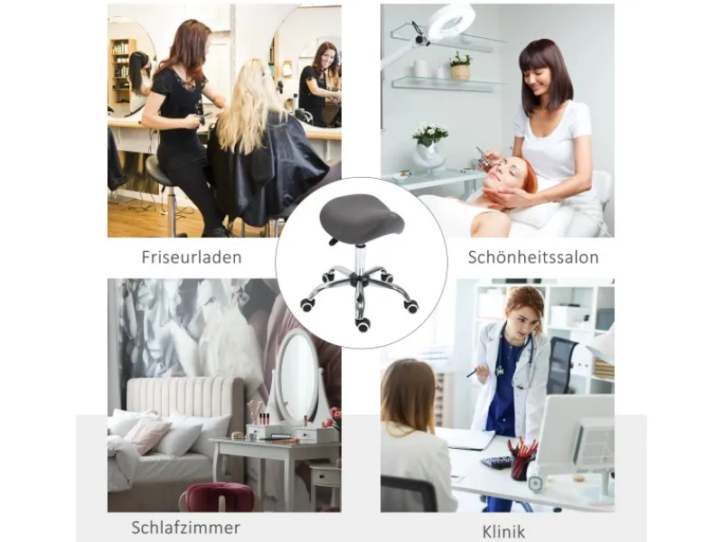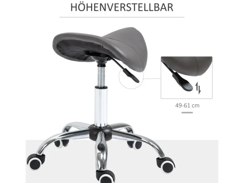 Dieser ergonomische Rollhocker in Sattelform von HOMCOM sorgt durch seine besondere Form des Sitzes automatisch für ein aufrechtes Sitzen, welches die Wirbelsäule entlastet. Der Praxishocker ist mit einer komfortablen Gasfeder ausgestattet, höhenverstellbar und drehbar. Die gepolsterte Sitzfläche ist aus glattem, pflegeleichtem Kunstleder hergestellt. Der Kreuzfuß des Hockers ist mit fünf stabilen Nylonlaufrollen ausgestattet. Der praktische Hocker ist ideal für den täglichen Gebrauch zu Hause, in jedem Friseursalon, Kosmetik-Studio oder in Büros.