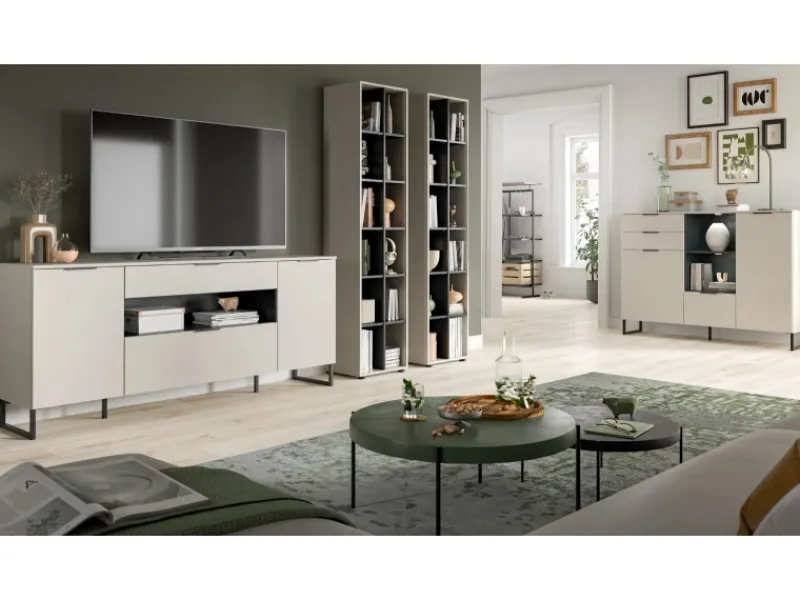 Die 3-teilige Wohnwand Morena in edlem Kaschmir mit schwarzen Absetzungen bringt modernes Design und Funktionalität in Ihr Wohnzimmer. Das Set mit großem TV-Lowboard (185 cm) und zwei Standregalen bietet auf 300 x 192 x 41 cm großzügigen Stauraum für Deko, Bücher und Technik. Soft-Close-Türen, Schubkästen und Klappen mit Gasdruckdämpfern sorgen für leises, komfortables Schließen. Mit Metallgriffen und Metallkufen steht Morena für Qualität. Pflegeleichte Oberflächen, klare Linien und harmonische Farbgebung machen diese Wohnwand zum stilvollen Mittelpunkt Ihres Zuhauses.