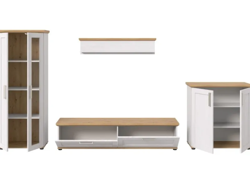 Die Wohnwand „Mirano“ im charmanten Landhaus Design ist die perfekte Einrichtung für Ihren Wohnbereich. Mit Front und Korpus in weißem Sibiu Lärche Dekor und Absetzungen in Artisan Eiche Dekor überzeugt sie mit einer gekälkten Optik. Die 4-teilige Wohnkombination umfasst eine Vitrine, eine Kommode, ein TV-Lowboard und ein Wandboard – alles, was Sie für ein organisiertes Wohnzimmer benötigen. Mit vier Vitrinenfächern und neun geschlossenen Fächern bietet sie viel Stauraum. Die Bügelgriffe in der Farbe Silber verleihen der Schrankwand eine harmonische Note. Mit Maßen von ca. 336 x 161 x 40 cm passt die Anbauwand in nahezu jeden Wohnbereich.