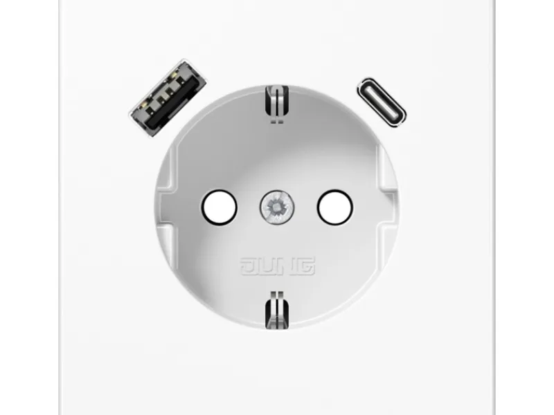 Die Schutzkontakt-Steckdose mit USB-Ladegerät besteht aus lackiertem Thermoplast (bruchsicher) und besitzt einen integrierten erhöhten Berührungsschutz. Die Steckdose ist zusätzlich mit einer USB-Buchse Typ A und einer USB-Buchse Typ C ausgestattet. Sie besitzt Federklemmen für starre und unbehandelte flexible Leiter bis 2,5 mm².