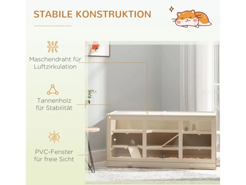 Dieser Kleintierkäfig von PawHut ist ideal für Hamster, Meerschweinchen und andere Kleintiere. Ein perfekter Wohn- und Auslaufbereich, in dem sie sich wohl und glücklich fühlen. Hergestellt aus einer Holzkonstruktion mit PVC-Fenstern und einer oberen Tür. Das Oberteil ist mit einem Drahtgeflecht versehen, das ebenfalls vollständig geöffnet oder von 30 bis 60 Grad eingestellt werden kann, so dass viel frische Luft vorhanden ist. Dieser Käfig bietet ihnen einen sicheren und trockenen Platz zum Leben und Spielen.