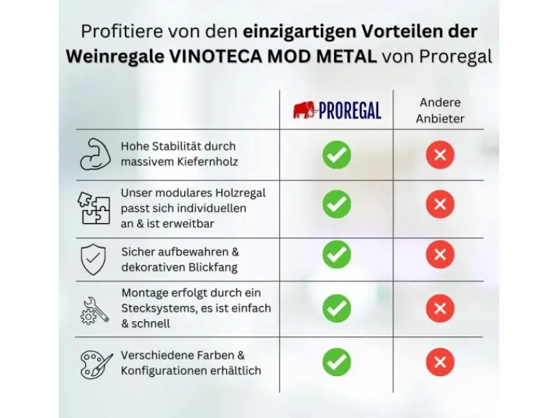 Schreibe die erste Bewertung für „Outlet PROREGAL Modulares Weinregal Vinotega Mod Metal HxBxT 42,5 x 12,5 x 24,5 cm 1 x 4 Flaschen Massives Kiefernholz Natur Kiefer Natur“