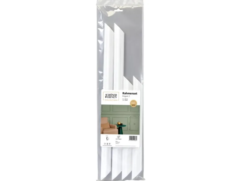 Die Leiste Elegant 3 besteht aus hochverdichtetem extrudiertem Polystyrol, ist wasserdicht und stoßfest und eignet sich daher für den Einsatz in Bädern, Küchen und vielbeanspruchten Wohnbereichen. Mit jedem Set kann ein Rahmen mit den Maßen 39 cm x 59 cm hergestellt werden, ohne dass etwas zugeschnitten werden muss. Die Zierleiste ist bereits grundiert und kann überstrichen werden. Dank ihres geringen Gewichts ist ihre Installation an Wand und Decke mit dem Kleber Decoflair CM500 sehr einfach.