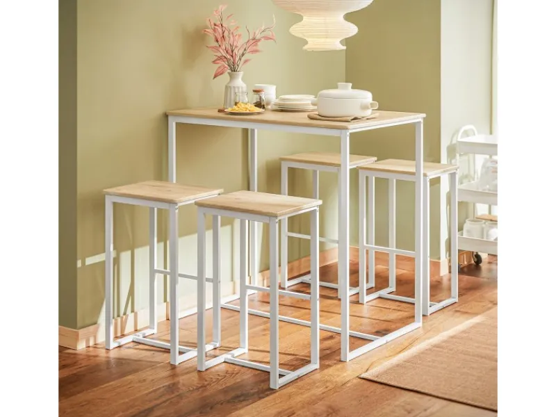 Bartisch und Barhocker aus weiß pulverbeschichtetem Stahlrahmen mit MDF(E1)-Platten, perfekt für Esszimmer, Wohnzimmer, Küche oder kleine Wohnungen.