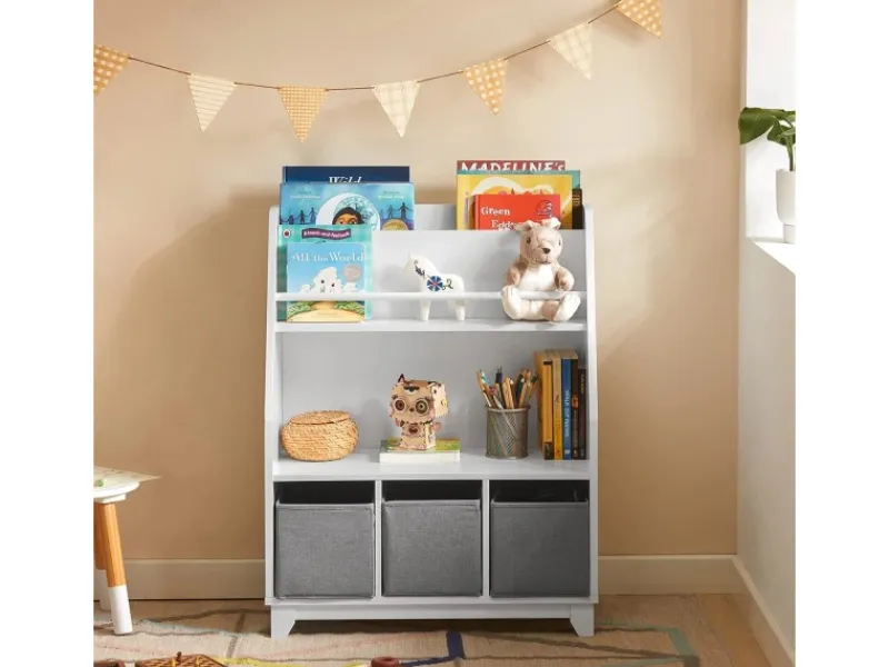 2 Fächer für Bücher und 3 Aufbewahrungsboxen für andere Lieblingsdinge- Dieses Regal macht Aufräumen zum Vergnügen.