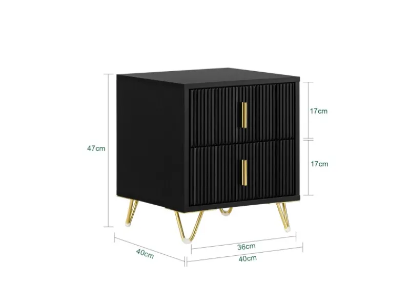 Die klassische schwarze Farbe und die goldenen Metallgriffe verleihen dem Nachttisch einen modernen und eleganten Look, der perfekt in jeden Raum passt.