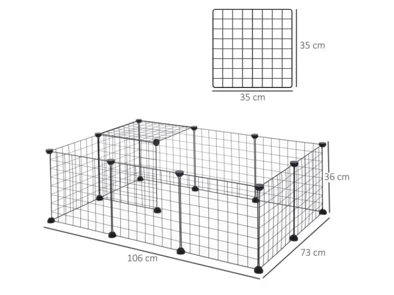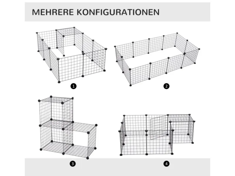 Mit diesem praktischen Freilaufgehege von PawHut können Sie Ihren Kleintieren ganz einfach zum Auslauf an der frischen Luft verhelfen. Die Gitterelemente werden ganz einfach mit den Kabelbindern zusammengesetzt, sodass Sie Größe und Form ganz einfach den Umständen entsprechend anpassen können. Durch das modulare Design kann der Auslauf nicht nur ganz schnell platzsparend verstaut, sondern auch vielseitig eingesetzt werden.