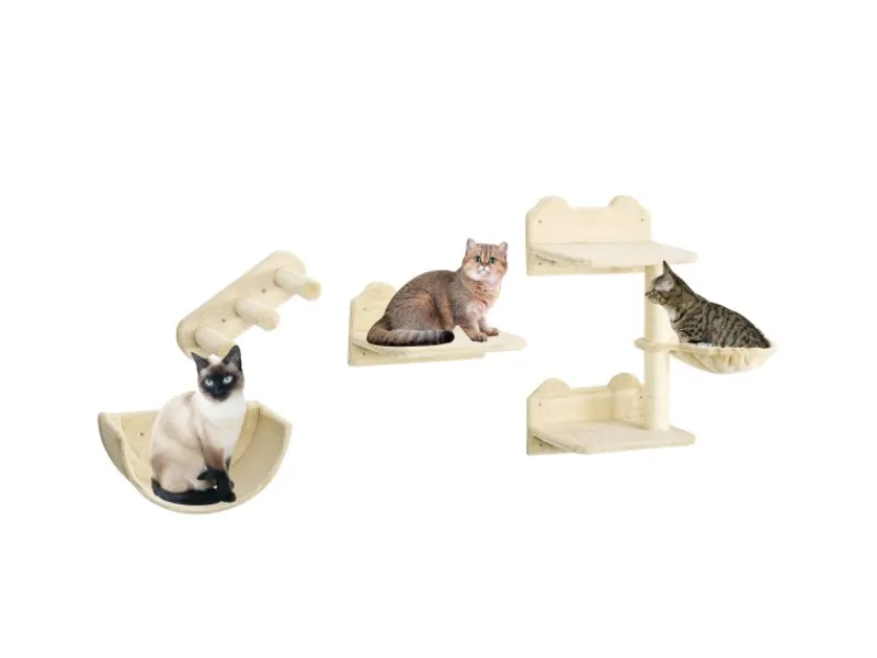 ● Katzen Kletterwand Set aus 4 Teilen, bestehend aus einem 3-stöckigen Kratzbaum mit Hängematte, einer flachen Plattform, einer Treppe und einer Liegeschale