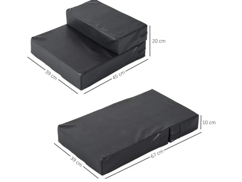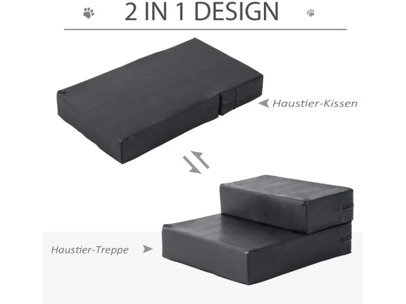 Die Katzentreppe von PawHut ist besonders für ältere Tiere mit Gelenkproblemen geeignet. So erreichen sie leicht das Sofa oder andere höher gelegene Orte. Dank des 2-in-1 Design lassen sich die Kissen außerdem auch so anordnen, dass sie als gemütliche Unterlage genutzt werden können. Das hochwertige PU-Leder lässt sich gut reinigen und der Bezug ist bei Bedarf abnehmbar. Die Kissen sind durch die dicke Schaumstoffpolsterung besonders weich und bequem. Mit der neutralen Farbe bringt die Treppe ein wohnliches Design mit und fügt sich perfekt in Ihre Raumgestaltung ein.