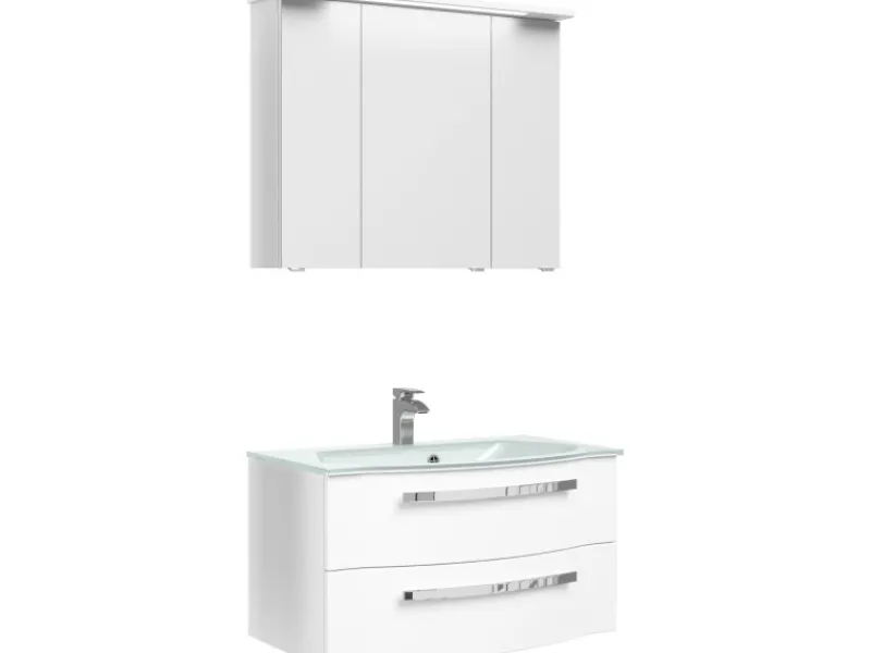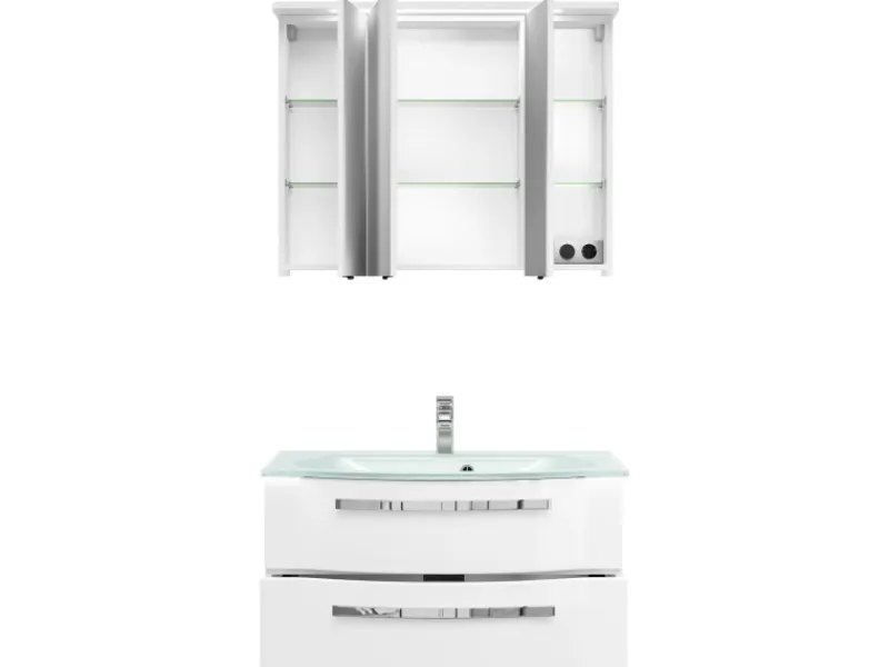 Der elegante Waschbeckenunterschrank überzeugt neben der ansprechenden Optik auch mit seiner hohen Funktionalität. Er ist mit zwei geräumigen Schubladen ausgestattet und bietet viel Platz für die optimale Aufbewahrung von Handtüchern & Co. Seine Auszüge sind mit praktischem Soft-Close-System ausgestattet. Dadurch ziehen sich die Schubladen auf den letzten Zentimetern sanft und leise ein. Der dreitürige Spiegelschrank mit sechs Glaseinlegeböden bietet den idealen Aufbewahrungsort für diverse Kosmetikartikel und Haarbürsten. Im Inneren befindet sich auch eine praktische Schalter/Steckdosenkombination, die eine einfache Handhabung des Föns & Co. ermöglicht. Die im Kranz integrierte LED-Beleuchtung sorgt mit ihren sparsamen LEDs in Tageslichtweiß für optimale Lichtverhältnisse in Ihrem Badezimmer.