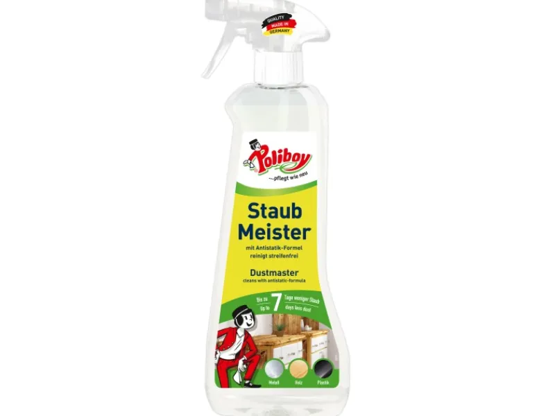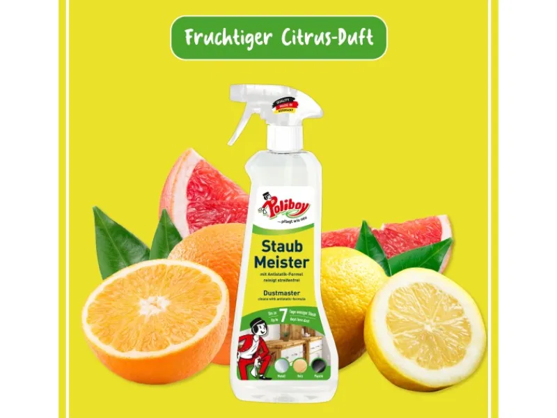 Der POLIBOY Staubmeister ist auf allen glatten Oberflächen wie versiegeltem Holz, Glas, Kunststoff oder Metall anwendbar und eignet sich für alle staubempfindlichen Einrichtungen. Der Reiniger beseitigt Staub, Fingerabdrücke und andere Verschmutzungen. Der Duft des Sprays sorgt für eine angenehme Frische während und nach der Anwendung. Die Oberflächen sind nach der Reinigung für mehrere Tage vor statischer Aufladung und damit schnellem Wiederverstauben geschützt. Die Flasche wird zu 100 % aus Recycling-Material hergestellt.