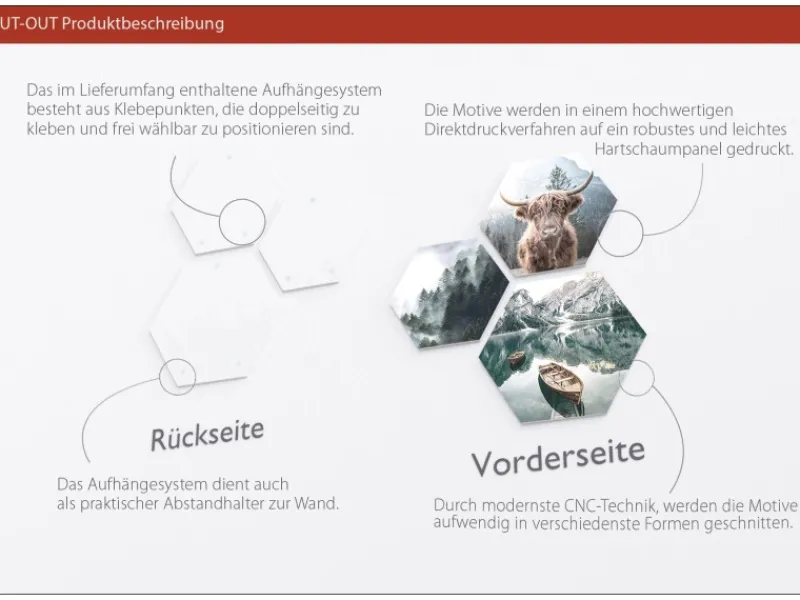 Bei den Pro Art Bildkacheln Cut-Out Forest Lake Atmosphere 3 Stk. 50 cm x 50 cm werden die Motive in einem hochwertigen Direktdruckverfahren auf ein robustes und leichtes Hartschaumpanel gedruckt. Durch modernste CNC-Technik werden die Motive aufwendig in verschiedenste Formen geschnitten.