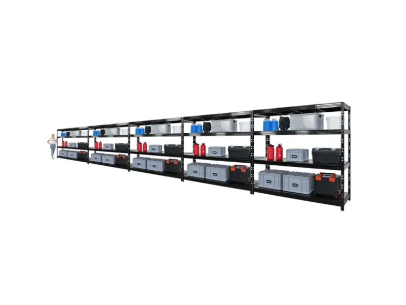 Das Schwerlastregal ist 180 cm hoch, 200 cm breit und 60 cm tief. Die Farbe ist Schwarz
