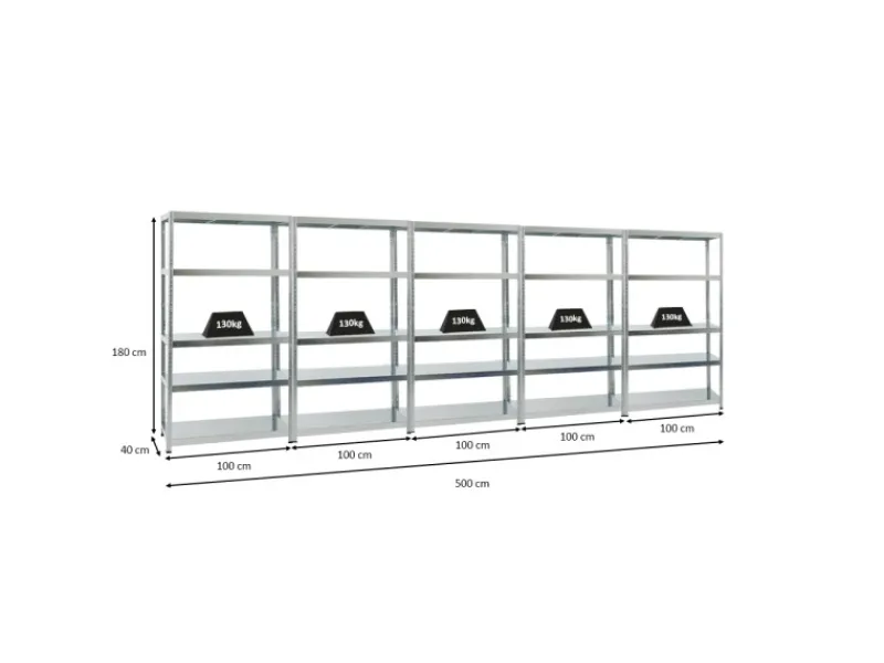 Hohe Traglast von 130 kg pro Ebene bzw. Gesamttraglast von 650kg für die 5 Ebenen pro Regal