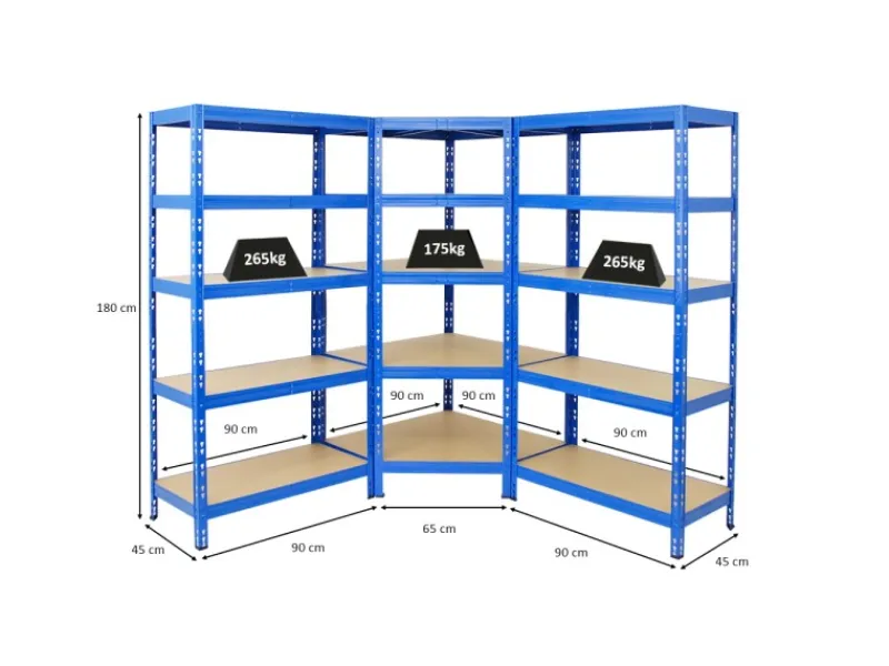 Mit dem Eckregal TIGER Mega Deal von PROREGAL schaffst Du Ordnung. Die Eckregalkombination gibt es in 2 unterschiedlichen Farben: schwarz und blau. Mit einer Fachbodenlast von 175 + 265 kg sind die Regale für die Werkstatt oder größere Lasten in der Garage bestens geeignet. Die beiden Regale an den Seiten haben jeweils eine Breite von 90 cm und eine Tiefe von 45cm.Die Produktion der Regale erfolgt nach höchsten Qualitätsstandards in der EU. Die Fertigung ist nach ISO 9001, ISO 28000 und ISO 50001 zertifiziert. Die FSC-Umweltanforderungen der Holzprodukte sind durch Preferred by Nature zertifiziert. Das Metall ist pulverbeschichtet, um eine lange Lebensdauer sicherzustellen und entgratet, um unangenehme Schnittkanten zu beseitigen. Der Aufbau ist einfach und erfolgt durch Steckmontage mit dem Butterfly-System. Es genügt ein Gummihammer. Um den Schwerlastregalen zusätzliche Stabilität zu geben, können die Regale an der Wand verschraubt werden. Natürlich ist die Verbindung der Regalen untereinander möglich. Darüber hinaus können die Regale jeweils in zwei Werkbänke umfunktioniert werden. Hierfür lassen sich die vertikalen Streben in der Mitte teilen, um so zwei separate Werktische bauen zu können.Selbstverständlich sind die 5 Fachböden in der Höhe verstellbar und zwar in einem 8 cm Raster. Die Einlegeböden aus MDF-Holzplatten haben eine Stärke von 8 mm und sind belastbar und leicht zu reinigen.Der Mega Deal ist Teil unserer TIGER Serie und daher hervorragend kombinierbar mit dem Schwerlastregal TIGER in 45 cm Tiefe, oder natürlich auch den jeweiligen Mega Deals.