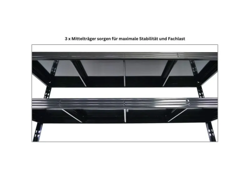 HOHE TRAGLAST – Mit einer Tragkraft von 500kg pro Ebene und einer Gesamttraglast von 2000kg ist das Regal ideal für schwere Lasten. 3 Mittelträger pro Fachboden sorgen für zusätzliche Stabilität.