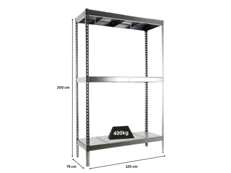 Das Schwerlastregal ist 200cm hoch, 120cm breit und 75cm tief. Die Regalfarbe ist Verzinkt.