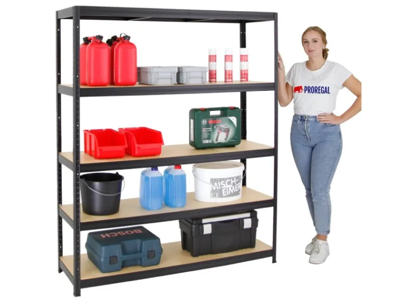 Das Schwerlastregal ist 180 cm hoch, 150 cm breit und 45 cm tief. Die Farbe ist Schwarz