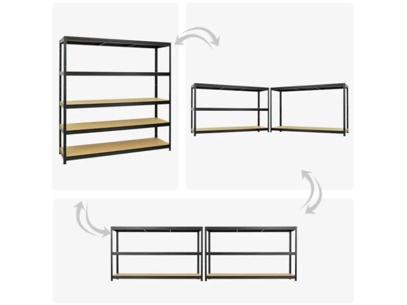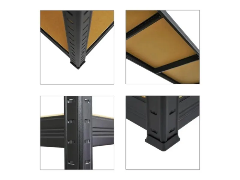 Das Schwerlastregal ist 180 cm hoch, 180 cm breit und 45 cm tief. Die Farbe ist Schwarz