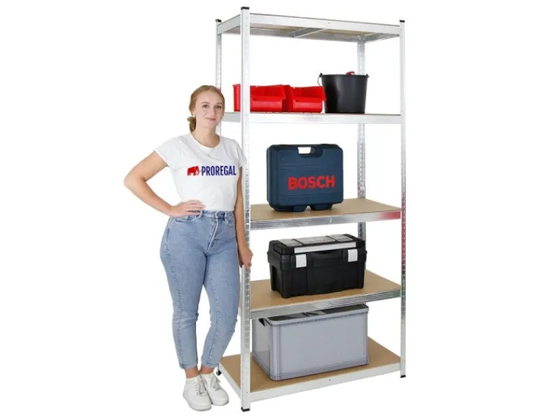 Das Schwerlastregal ist 200 cm hoch, 100 cm breit und 50 cm tief. Die Farbe ist Verzinkt.