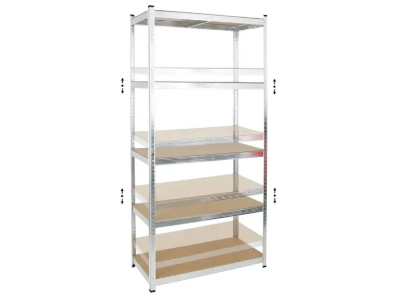 Selbstverständlich sind die 5 Fachböden in der Höhe verstellbar und zwar in einem 2,5cm Raster. Die Einlegeböden aus MDF-Holzplatten haben in Abhängigkeit von der Regalgröße eine Stärke von 5mm bis 10mm und sind belastbar und leicht zu reinigen.