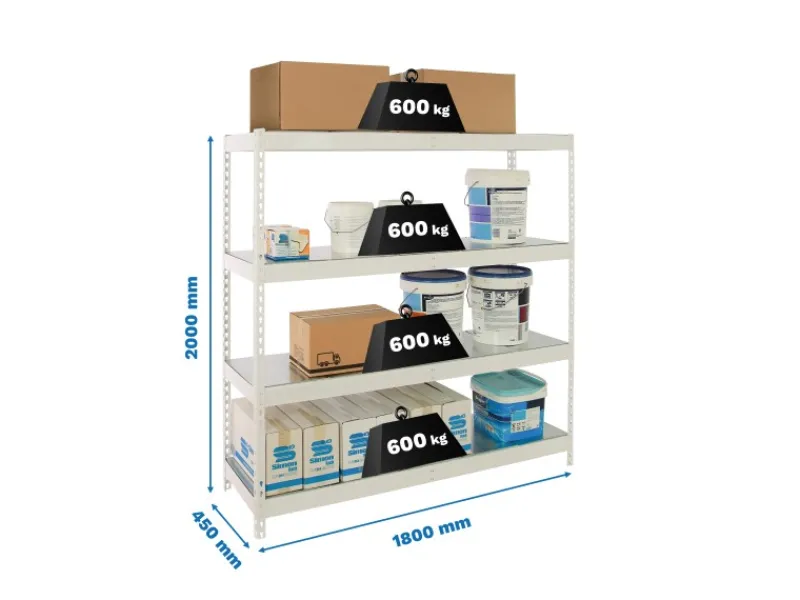 Das Regal ist 200 cm hoch, 180 cm breit, 45 cm tief und hat eine Fachlast von 600 kg.