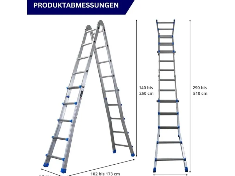 Mit einer Gesamtlänge von 5,2 m und einer Breite von 63 cm bietet die Mehrzweckleiter vielseitige Einsatzmöglichkeiten: Als Anlegeleiter erreicht sie eine maximale Höhe von 5,2 m und eine minimale von 2,9 m. Als Stehleiter beträgt die maximale Höhe 2,5 m, die minimale 1,43 m.