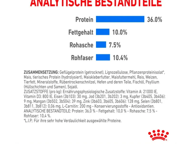 Geflügelprotein (getrocknet), Lignozellulose, Pflanzenproteinisolat*, Mais, tierisches Protein (hydrolysiert), Maiskleberfutter, Maisfuttermehl, Reis, Weizen, Tierfett, Mineralstoffe, Rübentrockenschnitzel, Hefen und deren Teile, Fischöl, Psyllium (Hüllschichten und Samen), Sojaöl.